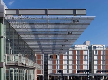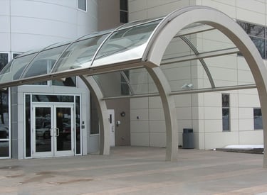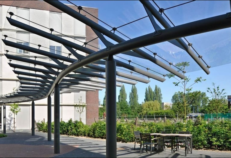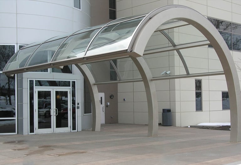 By applying differentiated curvature designs to glass panels and metal support structures, the two materials achieve visual and structural complementarity. The glass adopts smooth, flowing curves to enhance transparency and spatial continuity, while the metal incorporates precisely engineered structural arcs to improve load-bearing capacity and wind resistance. This combination not only gives the canopy an elegant streamlined profile but also meets high standards of weather resistance and safety in architectural applications.