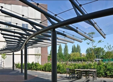 INDEPENDENT CANOPIES in apartment gardens enhance outdoor living areas for residents. These canopies provide shade for outdoor furniture, making patios and gardens comfortable for relaxation or socializing. They can also define spaces within the garden, creating a more intimate atmosphere. The design can complement the architectural style of the apartments, adding value to the property and improving residents' quality of life.
