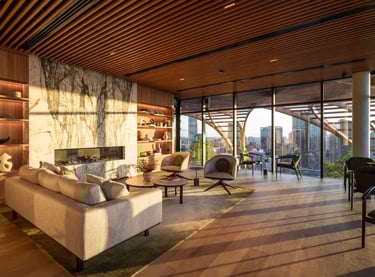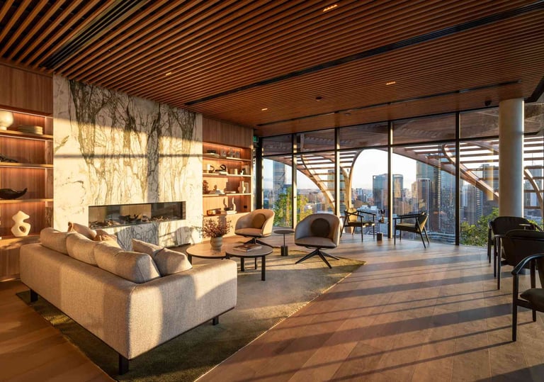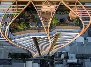 The top two levels, spanning over 2,000m², feature world-class amenities designed to foster community and enhance wellbeing. These include an infinity pool, spa, saunas, fitness club, yoga studio, boardroom, lounge bar, cinema, all set within tropical landscaping.