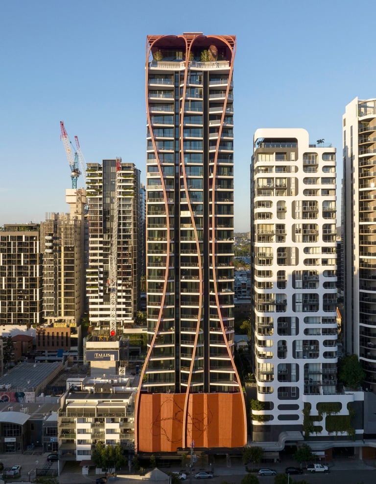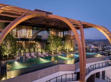 The architecture celebrates Brisbane’s natural beauty and laidback urban lifestyle, punctuating the city skyline with a natural timber pergola and tropical rooftop oasis. A five-storey indigenous artwork at the building’s podium reflects our unique history.