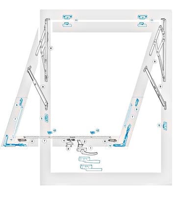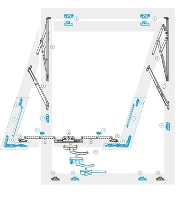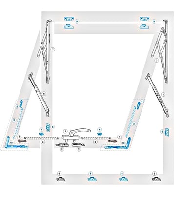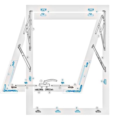 A hardware mechanism specifically designed for the awning and casement window system, with pre-designed positioning and tooling, which can quickly assemble hardware and improve work efficiency.