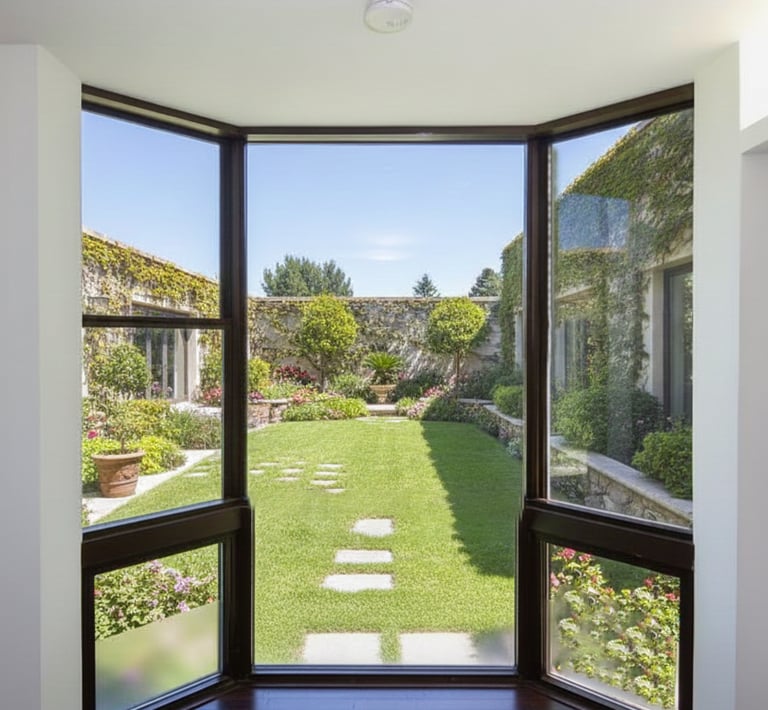 Bay windows extend outward from the building façade to create a projecting architectural volume that increases interior space, natural light, and external views. Typically configured with a central fixed panel and two operable side windows, a bay window allows daylight to enter from multiple angles while providing effective natural ventilation.