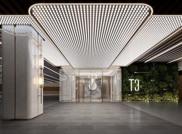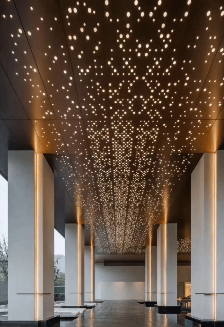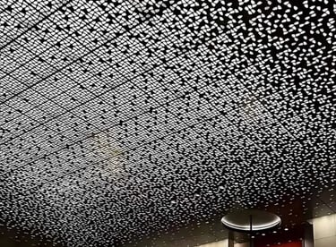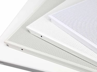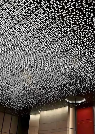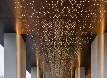 This section with celing tles made of perforated metalbegins with unique paterms that adoptaesthetics, function, androom themes, Designers play with shapes and sizes toachieve striking visuals and to perfect sound quality in the design impact.