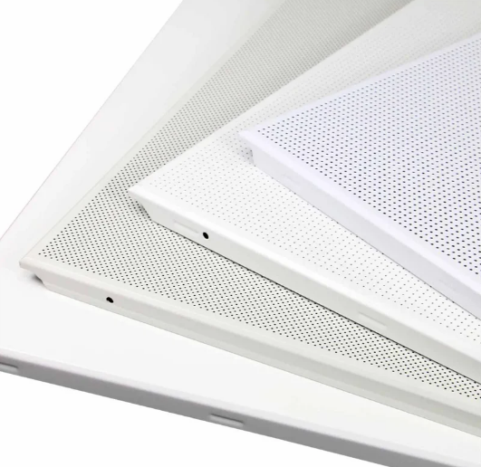 The metal celing panels are precision pertorated in roung, sauare, sioted,or custom patterns, Sound that passes throuph these openings instead ofboundine off the roomdissipates sound energy, making less bounce and echo in the room.