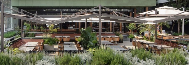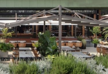 It seamlessly blends into the environment, offering protection from sun and rain while maintaining unobstructed views. This pergola creates a comfortable, inviting atmosphere, making it a versatile and practical choice for outdoor restaurants and events.