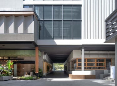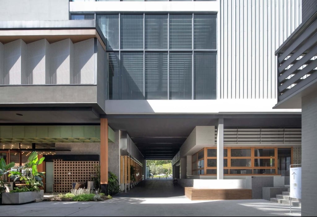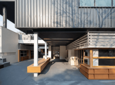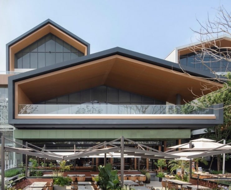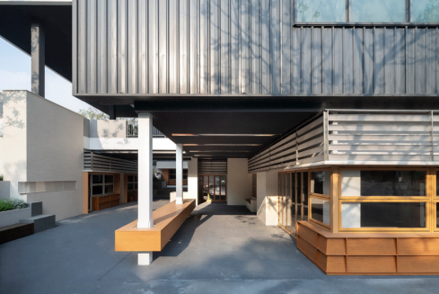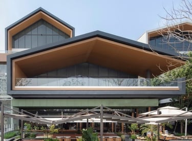 Perforated: The angled faceted design of the perforated panels not only adds a unique architectural aesthetic but also allows for natural ventilation and light filtering, enhancing both the functionality and beauty of the space.