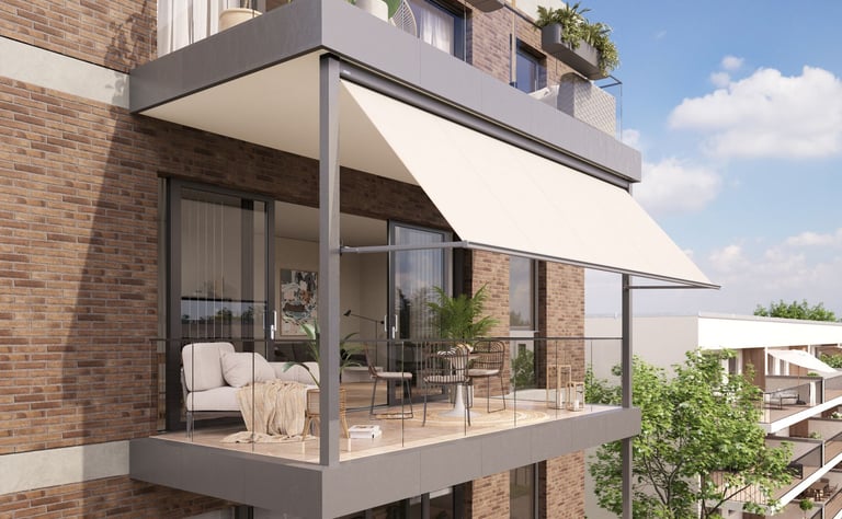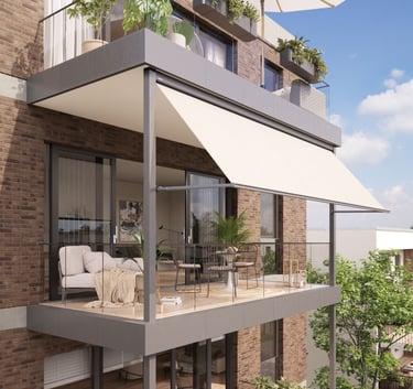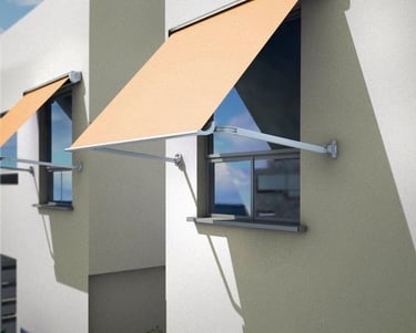 Drop-arm awnings are suitable as sun protection for windows as well as balconies. The use of drop arms with high-quality stainless steel gas springs creates optimal cover tension. The fully enclosing cassette protects the fabric cover perfectly and the small cassette profile provides a discreet look that matches any building.