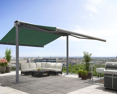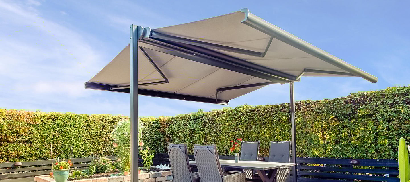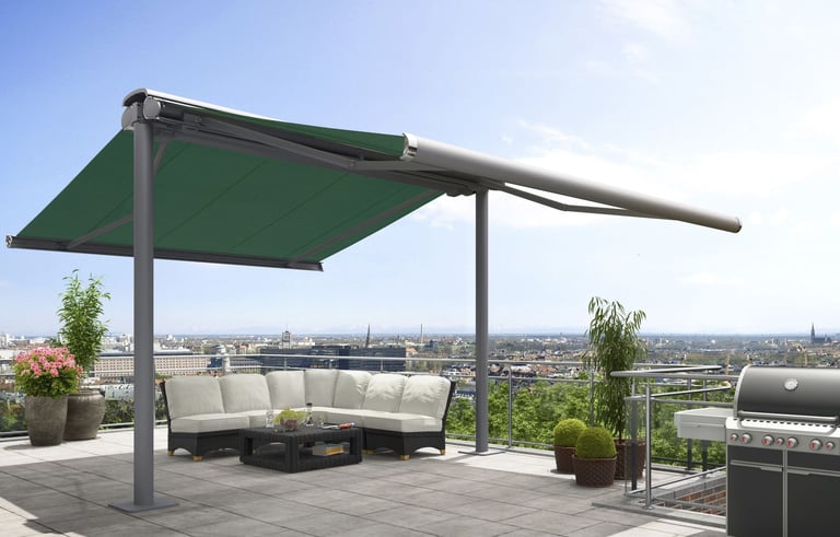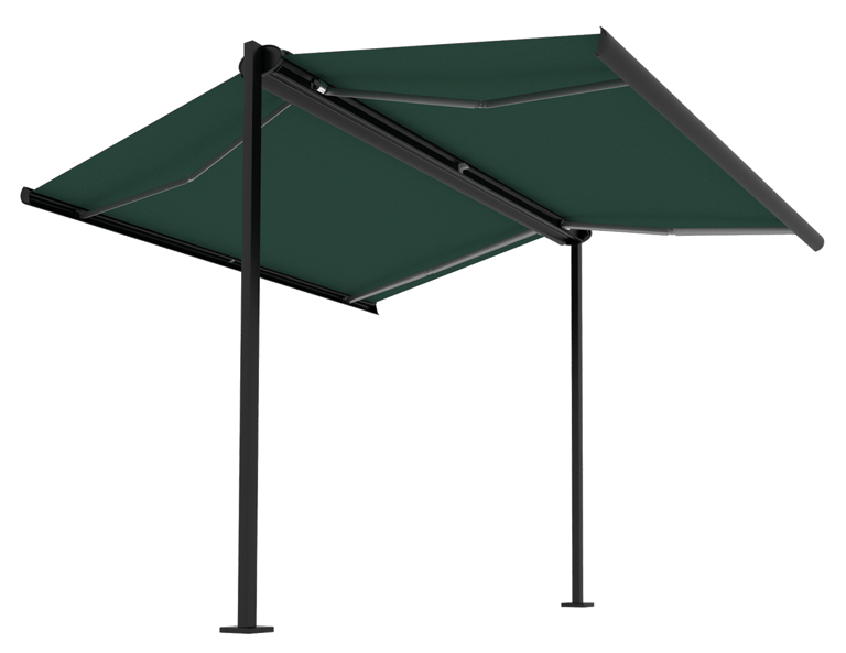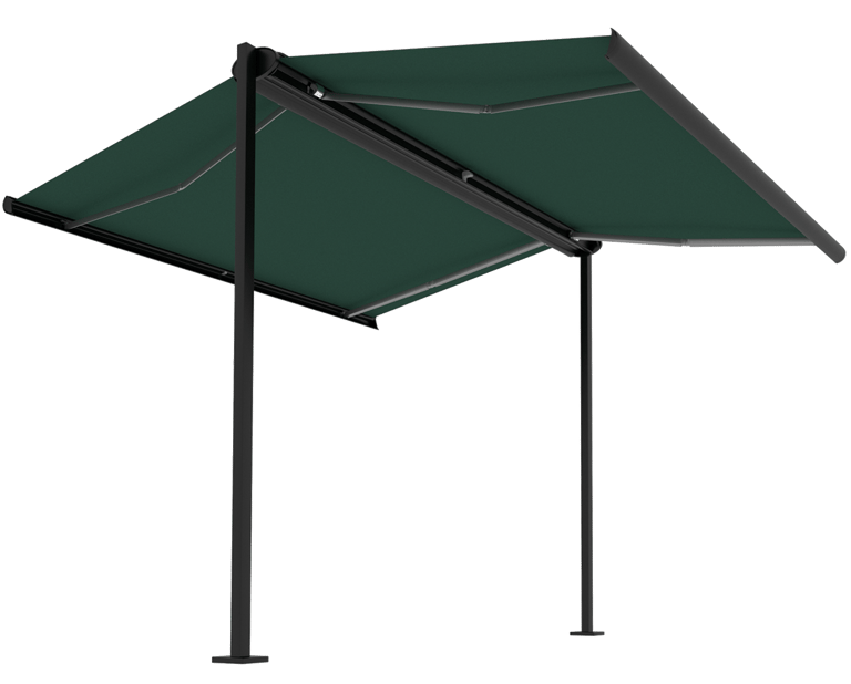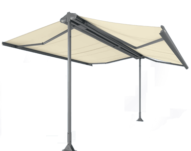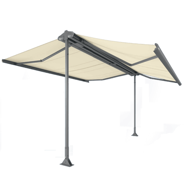 Two supports – available in round or angular designs – along with a sturdy cross beam, provide exceptional stability. Based on preferences, one or two retractable arm awnings or pergola-style awnings can be mounted. The system can either be securely fixed to the ground ("fix") or set up with weighted bases ("flex").
