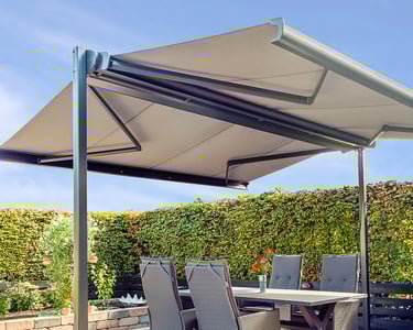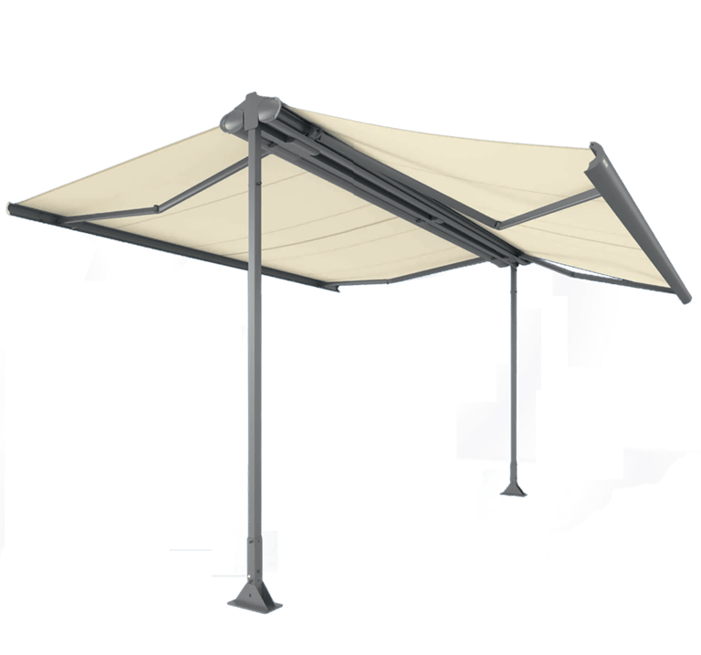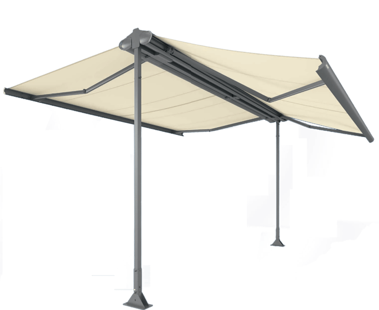 The free-standing awning system provides flexible shade for gardens, decks, and outdoor areas—no existing structure needed. It’s a stylish, functional solution for all-weather outdoor comfort.