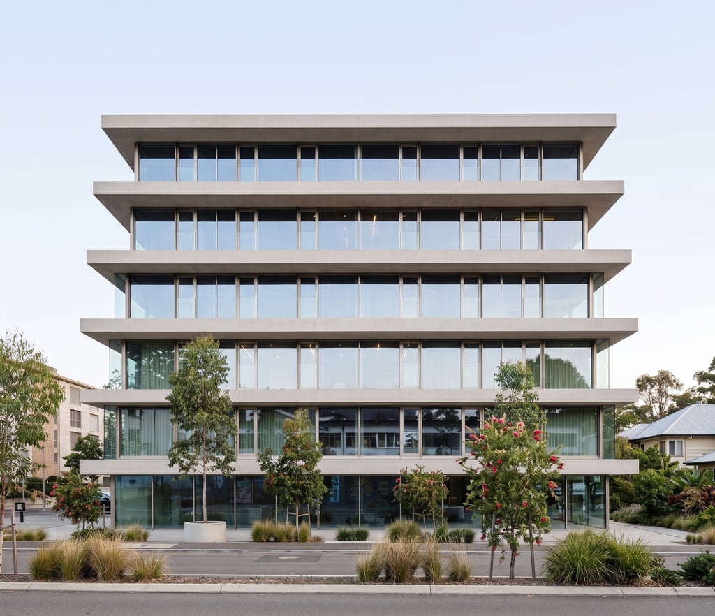 The facade adopts a horizontal ribbon composition combined with panoramic glazing. Large glass panels contrast with light-colored aluminum cladding, emphasizing horizontal extension. Continuous overhangs act as both architectural features and passive shading devices, reducing solar heat gain.