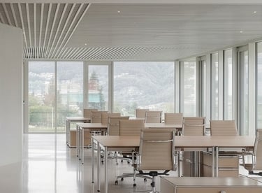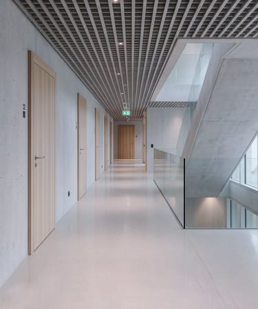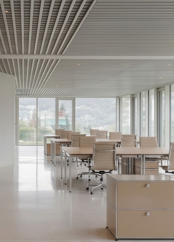 The office area continues the project’s minimalist and rational design language, utilizing large-scale curtain wall glazing to maximize natural daylight and create a bright, open working environment. The clear facade rhythm and expansive views enhance spatial order and visual continuity, elevating the overall workspace experience.