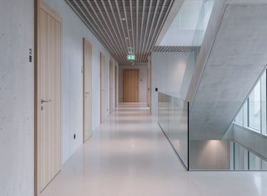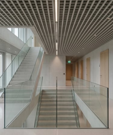 The project adopts a frameless railing system throughout all staircases and interior spaces. The minimalist design reduces visual obstruction, creating a more open and lightweight environment. High-strength tempered/laminated glass ensures safety while maintaining visual continuity, enhancing the overall spatial quality and modern aesthetic.