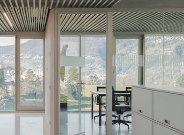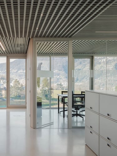 The office interiors primarily utilize single-glazed glass partition systems, featuring slim-profile frames that emphasize transparency and spatial continuity. Large tempered glass panels maintain an open visual connection while effectively defining functional zones, creating a flexible and efficient workspace.