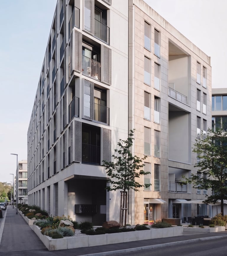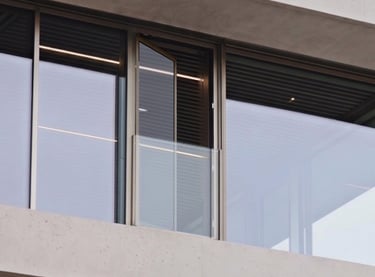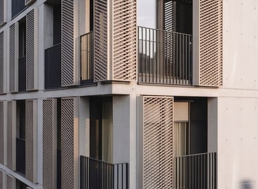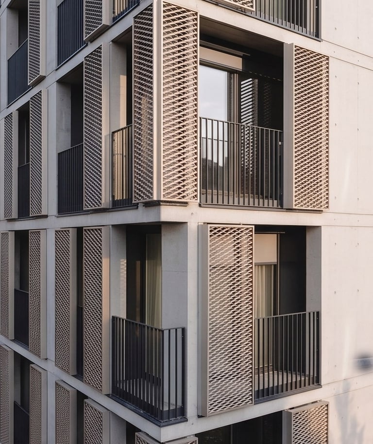 The rear facade serves residential apartments, with a strong focus on privacy and security. A movable louver screen system introduces layered depth and dynamic expression, while maintaining ventilation and natural light and enhancing privacy. Precision-engineered rollers and custom tracks ensure smooth, stable operation with long-term durability.