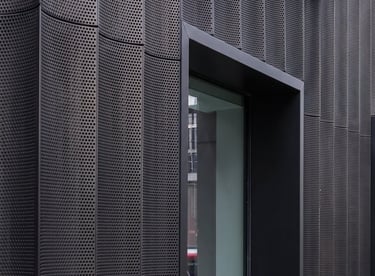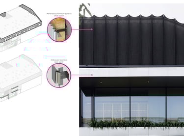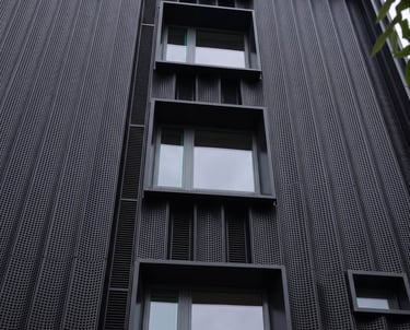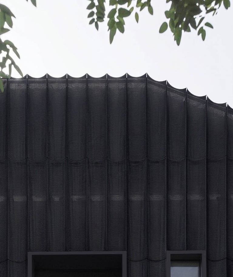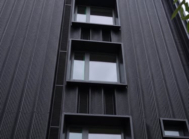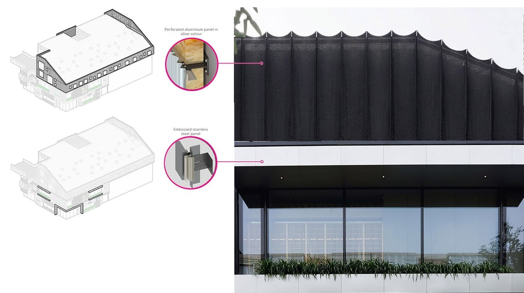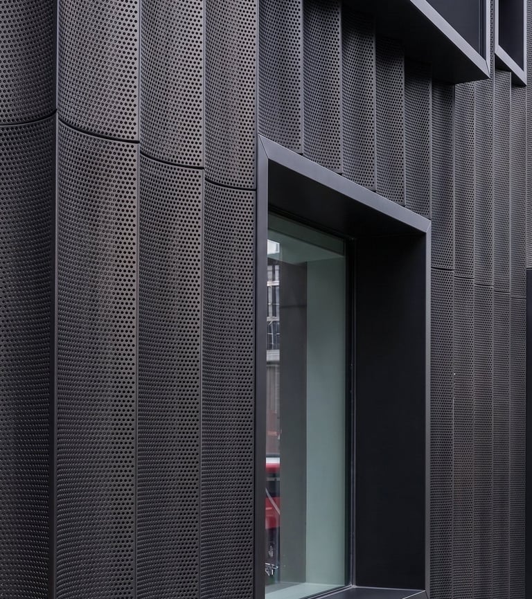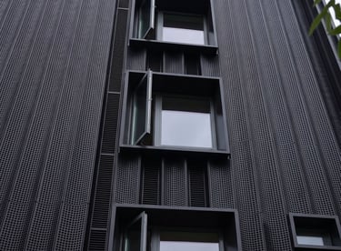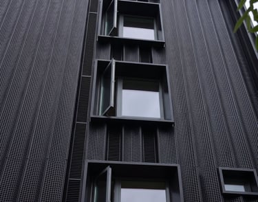 The facade features a custom metalwork system composed of curved perforated aluminium panels, creating a layered and rhythmic building envelope through smooth surface transitions and precisely arranged perforation patterns. The introduction of curved elements breaks away from conventional flat facades, allowing dynamic light and shadow variations across different viewing angles. The perforated design not only enhances visual texture but also balances shading, ventilation, and privacy, adding functional value to the facade.