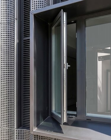In this commercial mall project, the outward opening window system is applied to retail façades and selected operable curtain wall areas. It supports natural ventilation while maintaining a clean, minimalist architectural language. Integrated with metal cladding and perforated aluminum panels, the operable units are visually minimized to ensure a continuous and refined façade appearance.