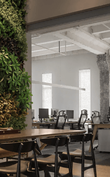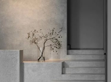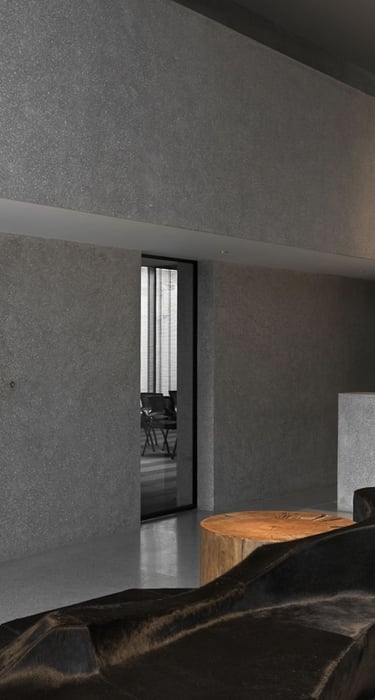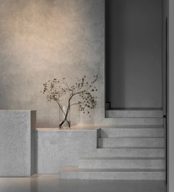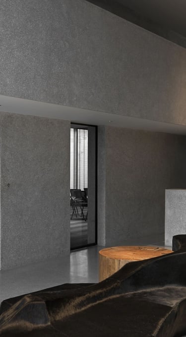The interior is predominantly adorned in shades of gray, with contemporary furniture displayed in harmony with the textured walls. The minimalist and orderly arrangement creates a bright yet gentle office atmosphere, blending subtle elements of classical and industrial design to form a unique architectural beauty.