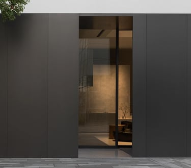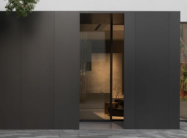 The main entrance uses an electric sliding door for convenience and security, while the top floor features a lift-and-slide door, offering expansive views and enhanced ventilation.