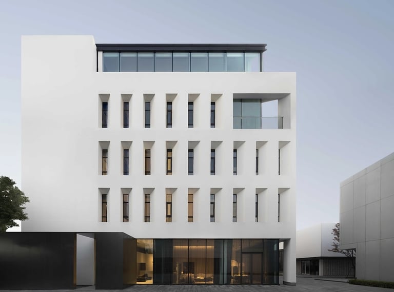 Expressing Eastern aesthetics through Western design principles, this building transforms the understanding of life into architectural beauty, balancing functionality, design, and artistry. The building's exterior façade embraces minimalism, with window grids as points, curtains as lines, and light and shadow as planes. Elegant yet restrained, it finds a harmonious balance between stability and lightness, individuality and unity.