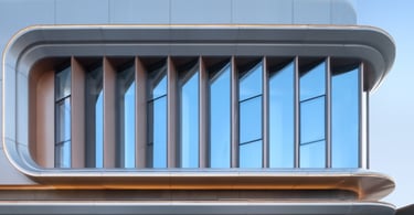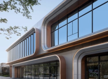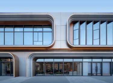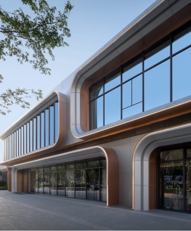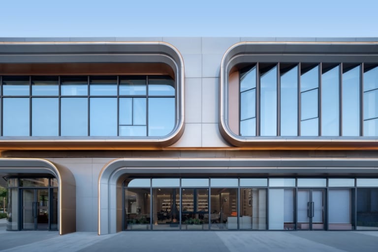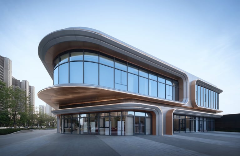 The facade design is sleek and modern, embodying the beauty of craftsmanship while rejecting unnecessary ornamentation. Curved glass and versatile aluminum create a dynamic arc, with champagne gold and silver-gray panels defining bold lines. The zigzag windows, crafted from glass and aluminum, add industrial precision, enhancing the building’s sense of quality, sophistication, and prestige.