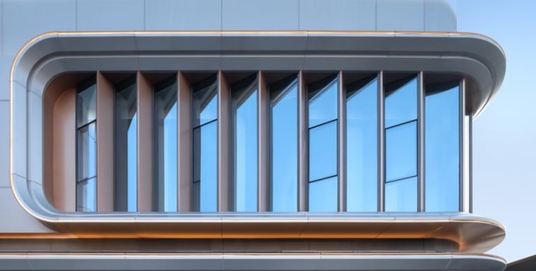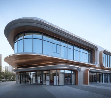 The facade features a seamless system that wraps around the building, incorporating "C"-shaped elements to highlight its flowing curves and create a sleek, dynamic tension. The surface treatment uses a carefully selected color palette, with metallic finishes that enhance light reflection and depth.