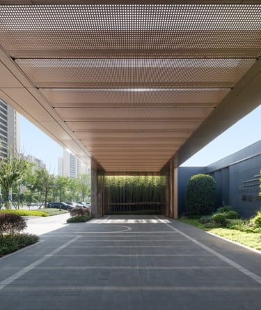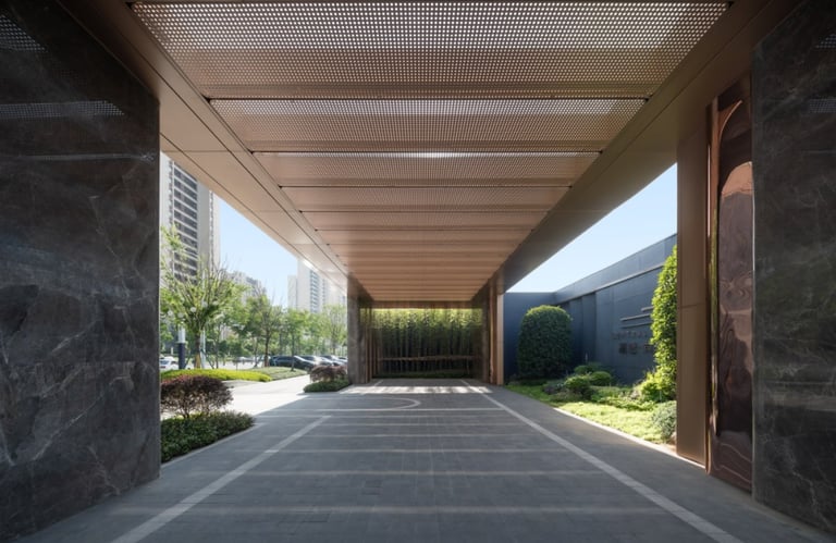 The application of perforated panels, champagne gold aluminum panels, and mirrored stainless steel at the top of the entrance gate showcases the architectural elegance and modernity. The combination of these materials adds depth to the facade, creating dynamic visual effects through light reflection and refraction.