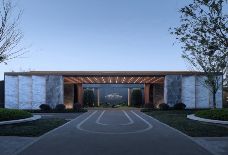 The main entrance serves as a microcosm of community life, symbolizing both quality and the sense of homecoming. The gate features deep gray and light gray stone as the primary facade materials, highlighting its high-end quality.