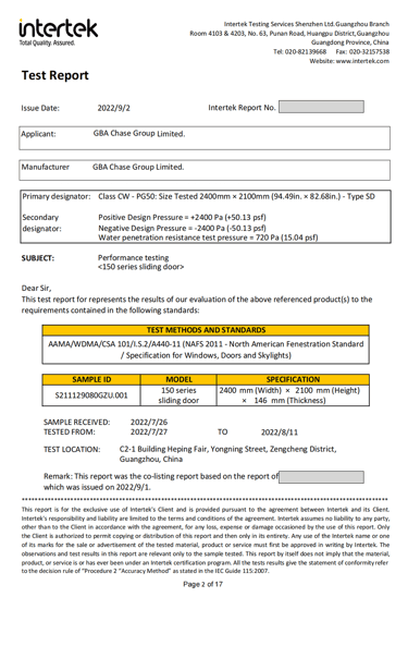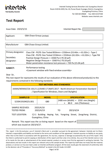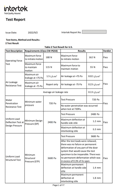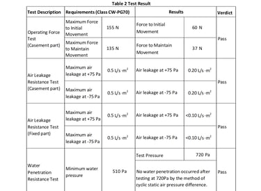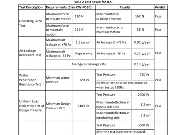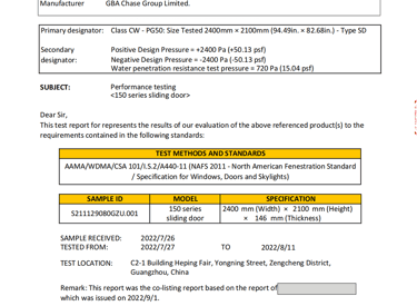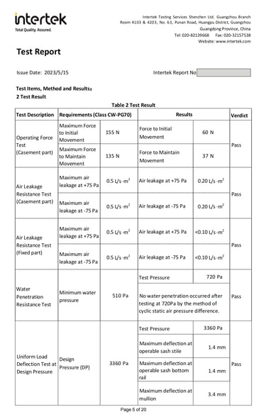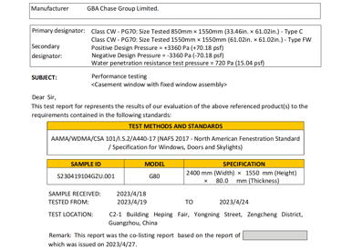 This document contains a partial test report for our G80 Casement Window with Fixed Window & 150 Sliding Door, conducted in accordance with North American standards. The report includes key performance evaluations such as air leakage, water penetration resistance, structural performance, and wind pressure resistance, ensuring that our product meets the stringent requirements set by ASTM and AAMA/WDMA/CSA 101/I.S.2/A440 (NAFS). These tests verify the window’s durability, energy efficiency, and ability to withstand extreme weather conditions, making it suitable for various building applications across North America.
